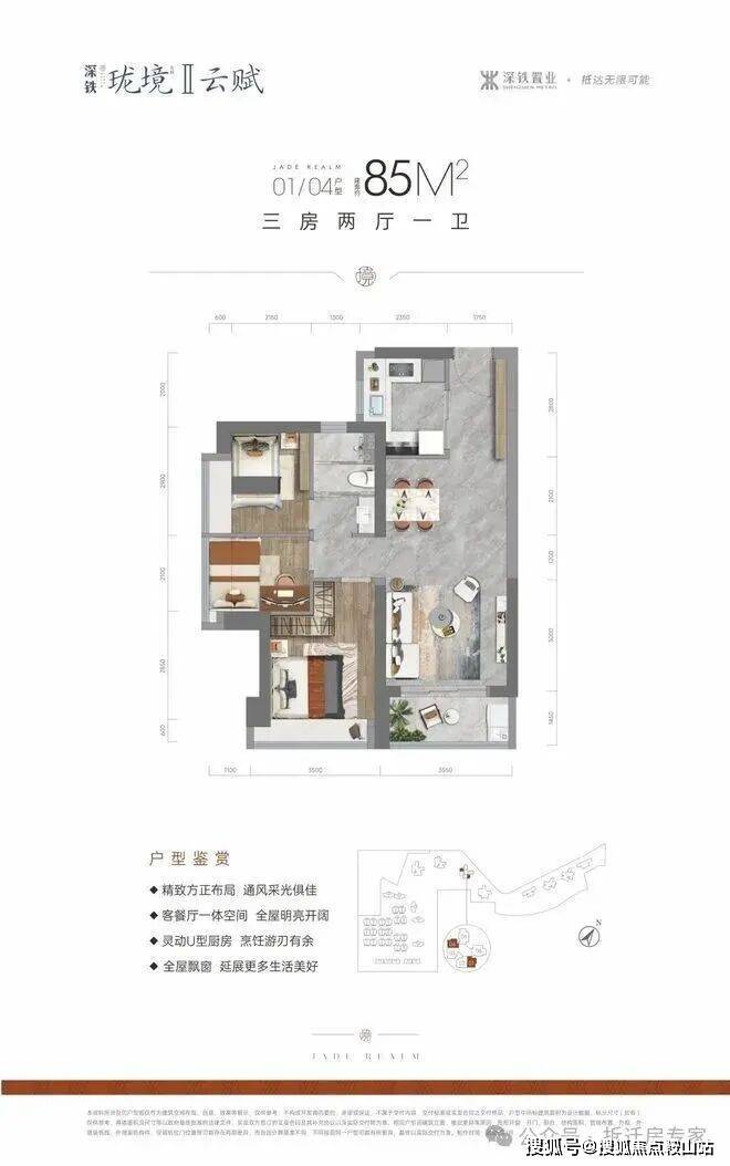85㎡的3房2厅1卫,设计的是竖厅格局,进门入户玄关,客厅3.6米开间,LDKB一体化设计,动静分区,U型厨房,卫生间三段式分离,得房率约75.4%(不含赠送),西南或东南朝向。
