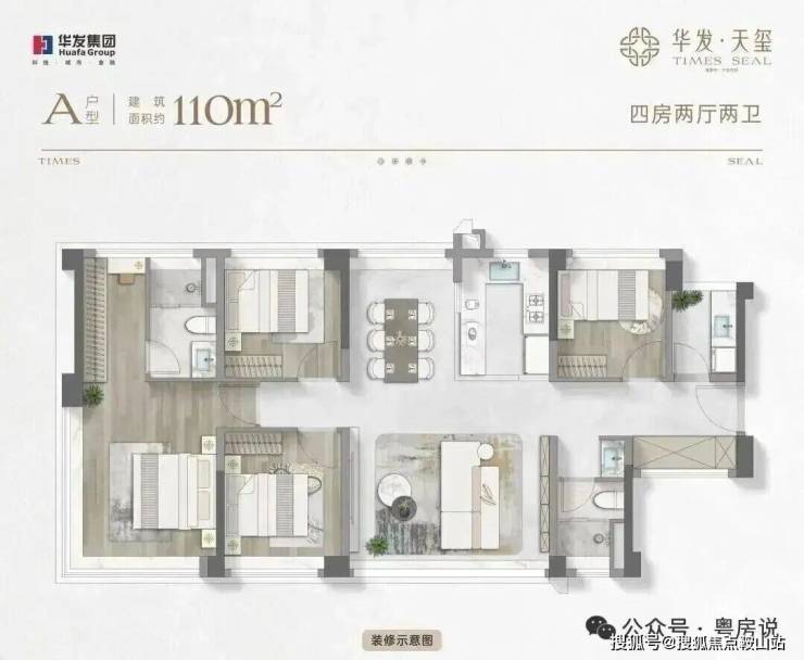 约110㎡四房两厅两卫:约16米通风面,户户是端户;约28㎡行政级端卧套房,270°景观视野,360°环统式采光