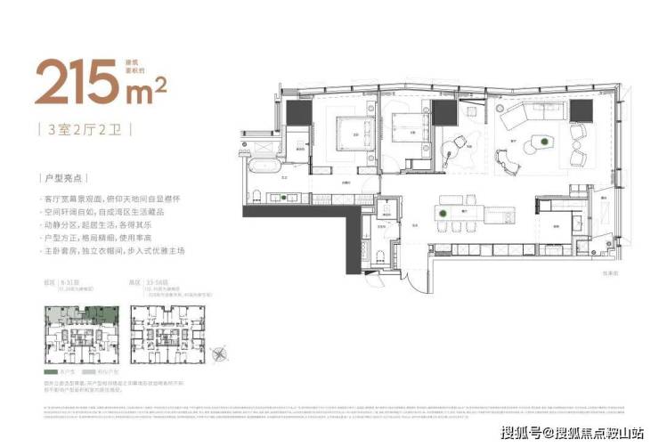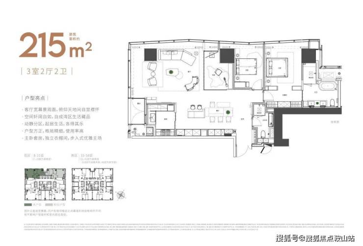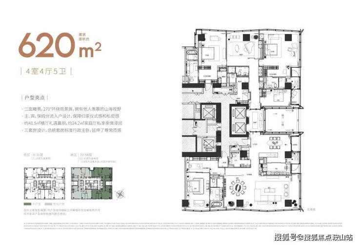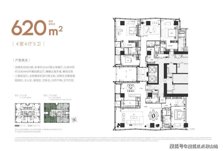大尺度空间 纵享环幕视野大平面大尺度定位,层高约3.6米,横厅设计确保奢阔观景面,全户型纵享环幕视野。项目打造建面约215-620㎡纯粹品质公寓,顶层为建面约1270㎡公寓产品。