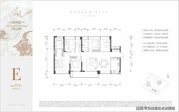 174㎡的5房2厅3卫,设计的是横厅南北通透格局,客餐厅7.4米开间,客厅连接次卧出7.3米长大阳台,五开间朝南,双套房设计,5个卧室分别为4米/3.2米/3米/2.9米/2.6米的宽度,U型厨房,公卫三段式分离,得房率:79.79%(不含赠送),阳台主朝西南向。