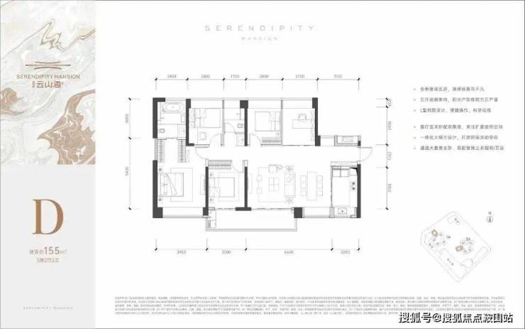 155㎡的5房2厅2卫,设计的是横厅南北通透格局,客餐厅6.6米开间,客厅连接次卧出大阳台,五开间朝南,5个卧室分别为3.9米/3米/2.8米/2.8米/2.7米的宽度,U型厨房,公卫三段式分离,得房率:76.87%(不含赠送),阳台主朝东南或西南向。