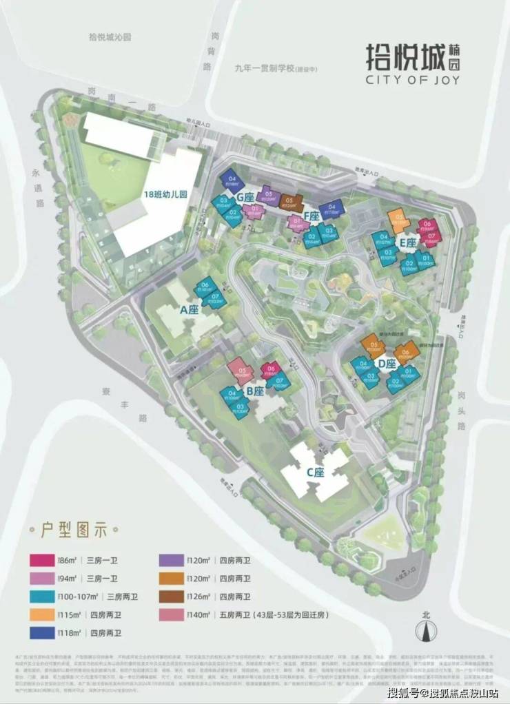 拾悦城楠园,总占地面积约3.54万㎡,总建筑面积约32.39万㎡,计容建筑面积约23.54万㎡,容积率6.4,绿化率40%,共由7栋总高48-53层的住宅组成,其中1栋A/B/C座53F,1栋D/E/F/G座住宅48F,2栋是1所18班制幼儿园。