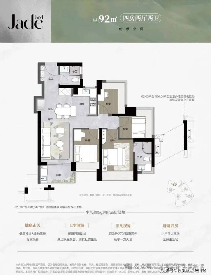 4、卓越珺奕府虽然不是新规产品,但是对比之前推出的1期产品,得房率还是有所提高的,加上赠送后整体得房率都去到了92%左右,92平户型也做到了4房2卫。