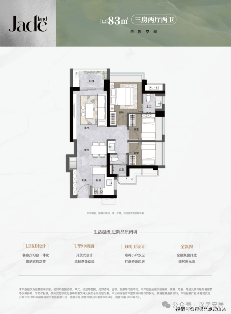 83㎡的3房2厅2卫 ,设计的是竖厅格局,进门入户玄关,LDKB一体化,S墙设计预留冰箱卡槽位,U型厨房,主卫少了淋浴,公卫三段式分离,得房率约90.33%(包含赠送),阳台西北朝向。