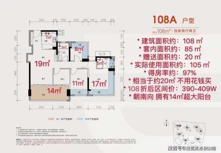 建筑面积约:108㎡,套内面积约:85㎡,赠送面积约:20㎡,实际使用面积约:105㎡,得房率约:97%,相当于约20㎡不用花钱买,朝南向 拥有14㎡超大阳台。