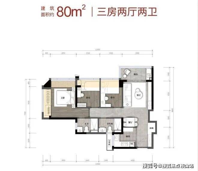 建筑面积约80㎡户型(竖厅)-3房2卫