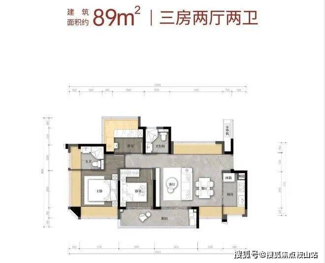 建筑面积约89㎡户型-3房2卫(竖厅)
