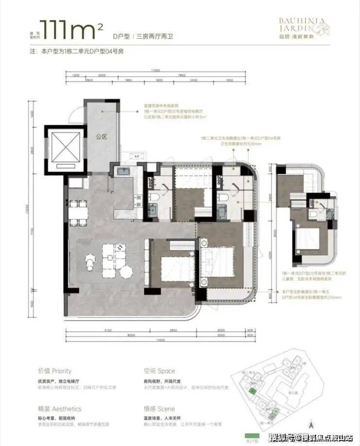 湾啟紫荆位于前海妈湾听海大道,占地约1.5万㎡,住宅建面约6.6万㎡,容积率5.14,共有三栋住宅组成,层高36-37F,共485户,车位595个,车位比1.1.2,4梯5户,主推约96㎡稀缺三房、111㎡3+1房、122㎡四房、142㎡四房。户型设计了大客厅、宽景阳台、阔景飘窗等,拥有山海河多重景观资源,计划品质精装交付。户型采用建筑新规设计,户户大阳台,4梯5户,分布式电梯设计,独立电梯厅。
