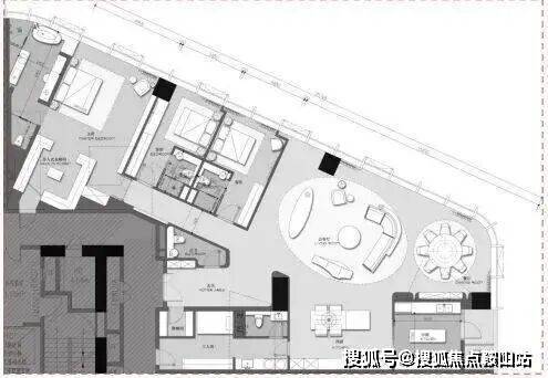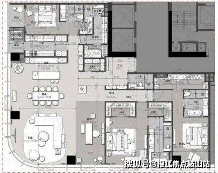 建筑面积约 439㎡,为 3 + 1 房 2 厅 2 厨 5 卫布局。该户型由 LSD 亲自操刀设计,拥有 270°城市与绿化景观,高区可看海景。采用全套房、双主卧设计,客餐厅开间超 10 米,方正主卧面积达 24㎡且为明卫设计,次卧带阳台,中西厨结合,还有多功能房,空间灵活多变。