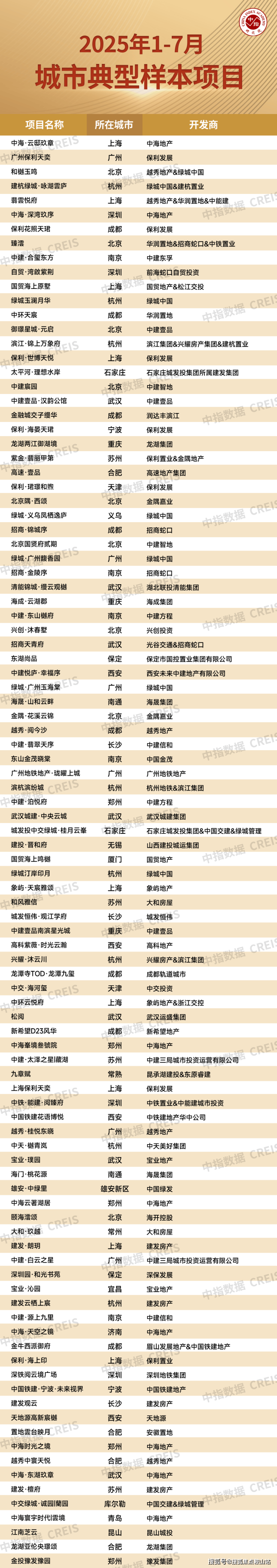 730政治局会议强调要“落实好中央城市工作会议精神,高质量开展城市更新”。未来针对城中村改造、“好房子”建设、优化土地供给等方面的相关政策有望持续推进。在此背景下,中指研究院在中房指数系统理论体系和架构的基础上,从百城价格指数样本项目中选取城市中有较强知名度和广泛影响力的典型样本项目,以“典型性”为基本原则,从销售表现、项目品质、品牌实力等维度出发,对主要城市样本项目进行研究,得出“2025年1-7月城市典型样本项目”,为行业提供标杆典范。