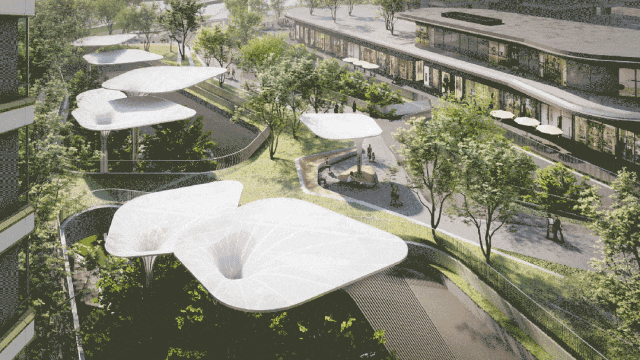 同时颠覆围合式布局,以生态中轴绿廊为核心,构建了一个融合居住、教育、办公、公园等的超级生态圈。