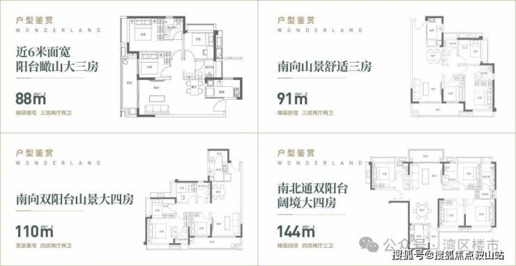 户型:88-91㎡三房两厅两卫、110㎡四房两厅两卫、144-163㎡四房两厅三卫、213㎡四房三厅三卫,以及325-417㎡复式。