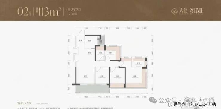 113㎡的4房2厅2卫,设计的是经典竖厅格局,客厅3.7米开间,LDKB一体化,S墙设计预留冰箱卡槽位,动静分区,四开间朝南,分别做到了主卧20.39㎡/次卧12㎡/次卧8.85㎡/次卧8.64㎡(包含墙体飘窗),U型厨房还带1个设备平台约2.7㎡,卫生间干湿分离,得房率约81%(不含赠送),客厅连接次卧出6.4米长的大阳台约11.52㎡,西南朝向。套内面积91.53㎡+飘窗15.36㎡+阳台5.76㎡+设备平台2.7㎡=实得面积115.35㎡,加上赠送后得房率约102.08%。