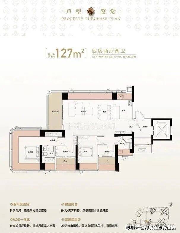 127㎡的4房2厅2卫,设计的是竖厅格局,尊享独立电梯入户,LDKB一体化设计,动静分区,六开间朝南,主卧270°无柱转角全景舱,L型厨房+岛台设计,卫生间干湿分离,得房率约105%(包含赠送),西北朝向看一线梧桐山景观。