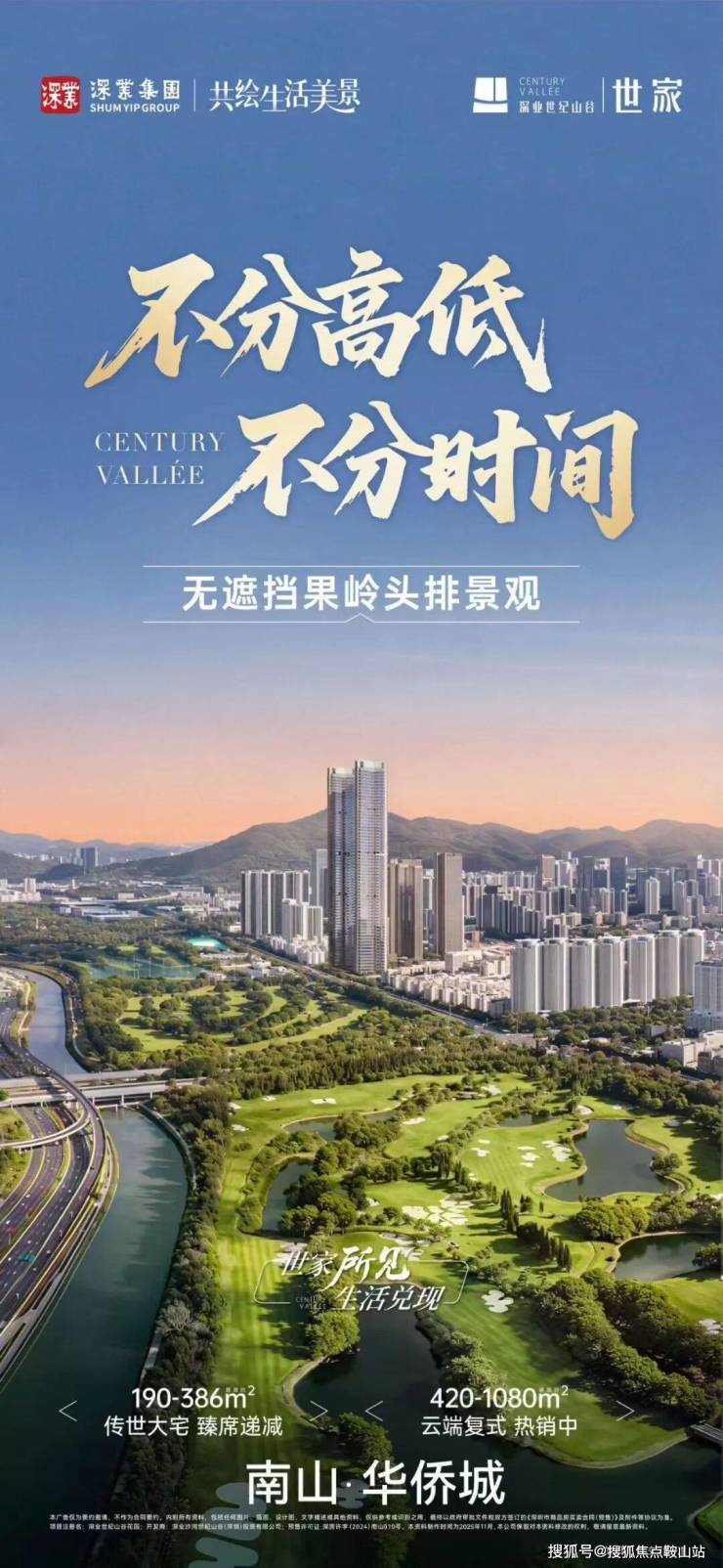 深业世纪山谷位于南山区沙河东路218号,占地面积约4.2万㎡,总建筑面积约38.9万㎡,是集住宅、公寓、酒店、商业和办公等多种业态于一体的城市综合体项目。项目位于大沙河生态长廊之上,西临约200万㎡果岭名商高尔夫球场,推窗可享一线果岭生态景观。而且南向可以俯瞰深圳湾海景,以及地标建筑春笋和跨海大桥,把“名片级”景观尽收眼底。目前片区能够同时拥有一线高尔夫果岭景观+深圳湾海景的宜居新房,真的是少之又少。