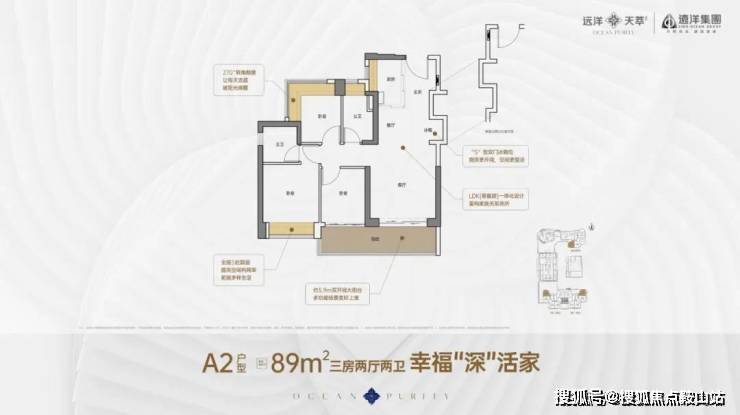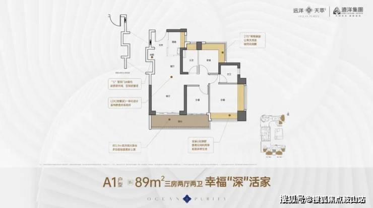 89㎡的3房2厅2卫,A1户型,设计的是竖厅格局,客厅3.5米开间,LDKB一体化,S墙设计预留冰箱卡槽位,客厅连接次卧出5.9米长的大阳台,主卧双面飘窗,次卧270度转角飘窗,U型厨房,卫生间干湿分离,得房率约72.57%(不含赠送),阳台有朝西向、东向、南向。🐎广州远洋天萃【售楼处电话】✅ 400-856-3771⭕(已认证)🎥❄️❇❇