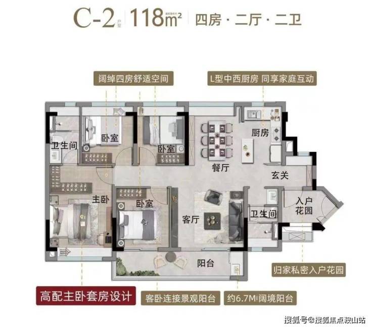 建面118平四房两卫,带入户花园,南北对流直厅布局,阳台约6.7米,主卧套房设计,配独立卫浴和转角衣帽间,总价470-510万左右。