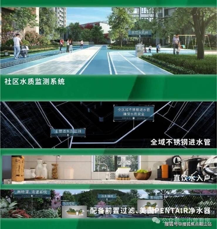 配备前置过滤系统、社区水质监测系统、全域不锈钢进水管、美国PENTAIR净水器(白宫同品牌)