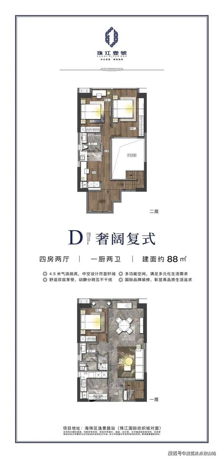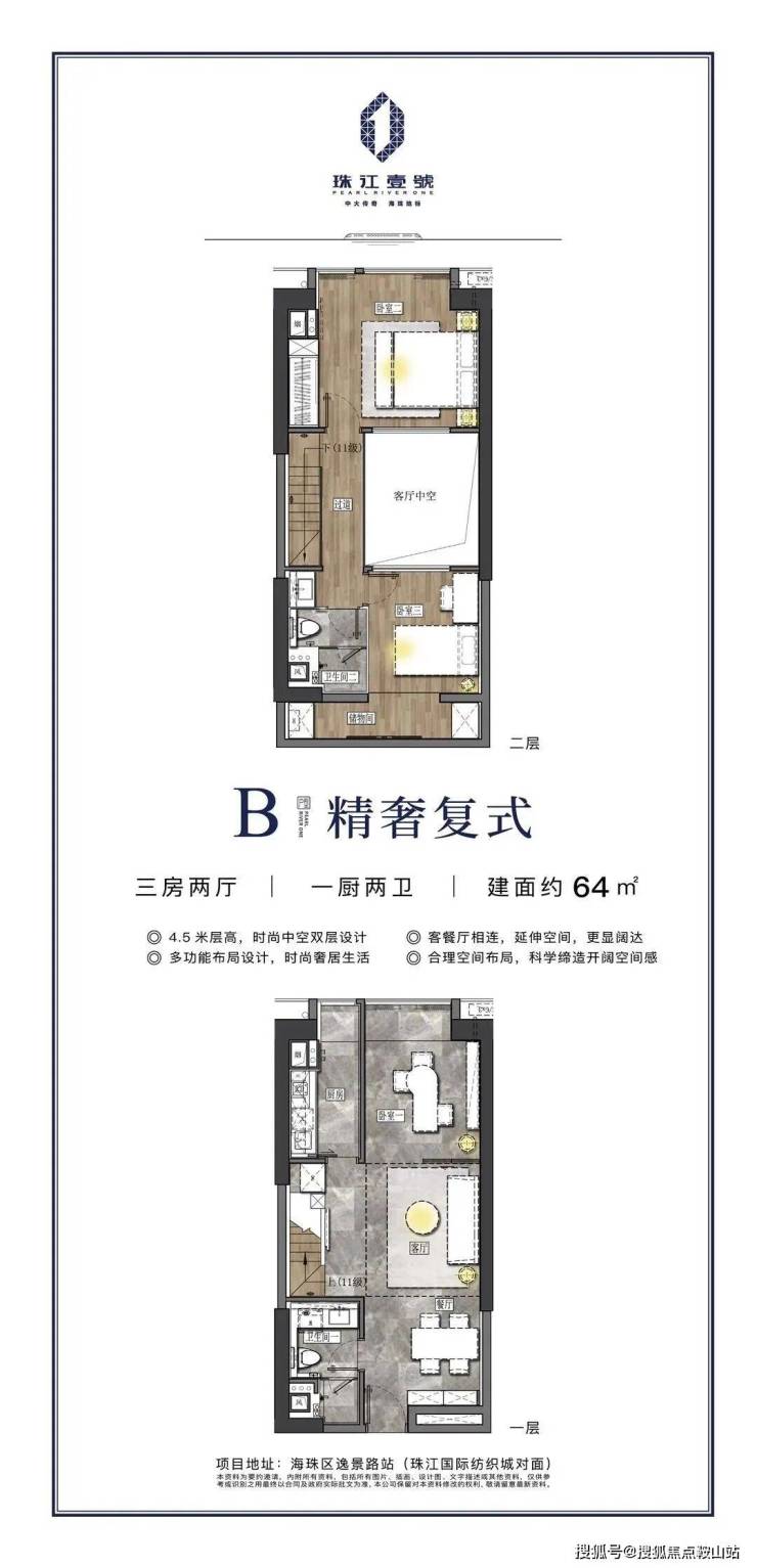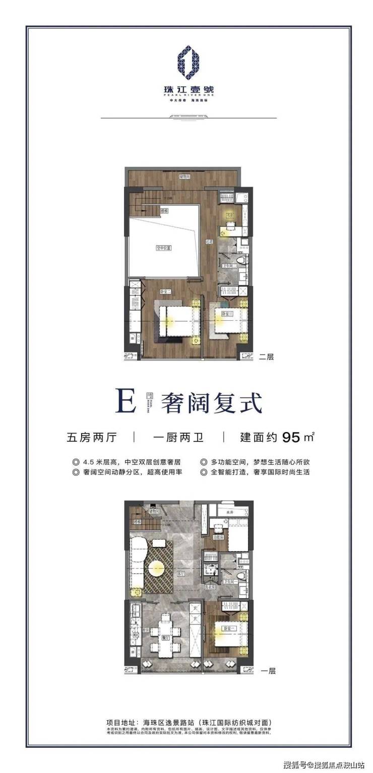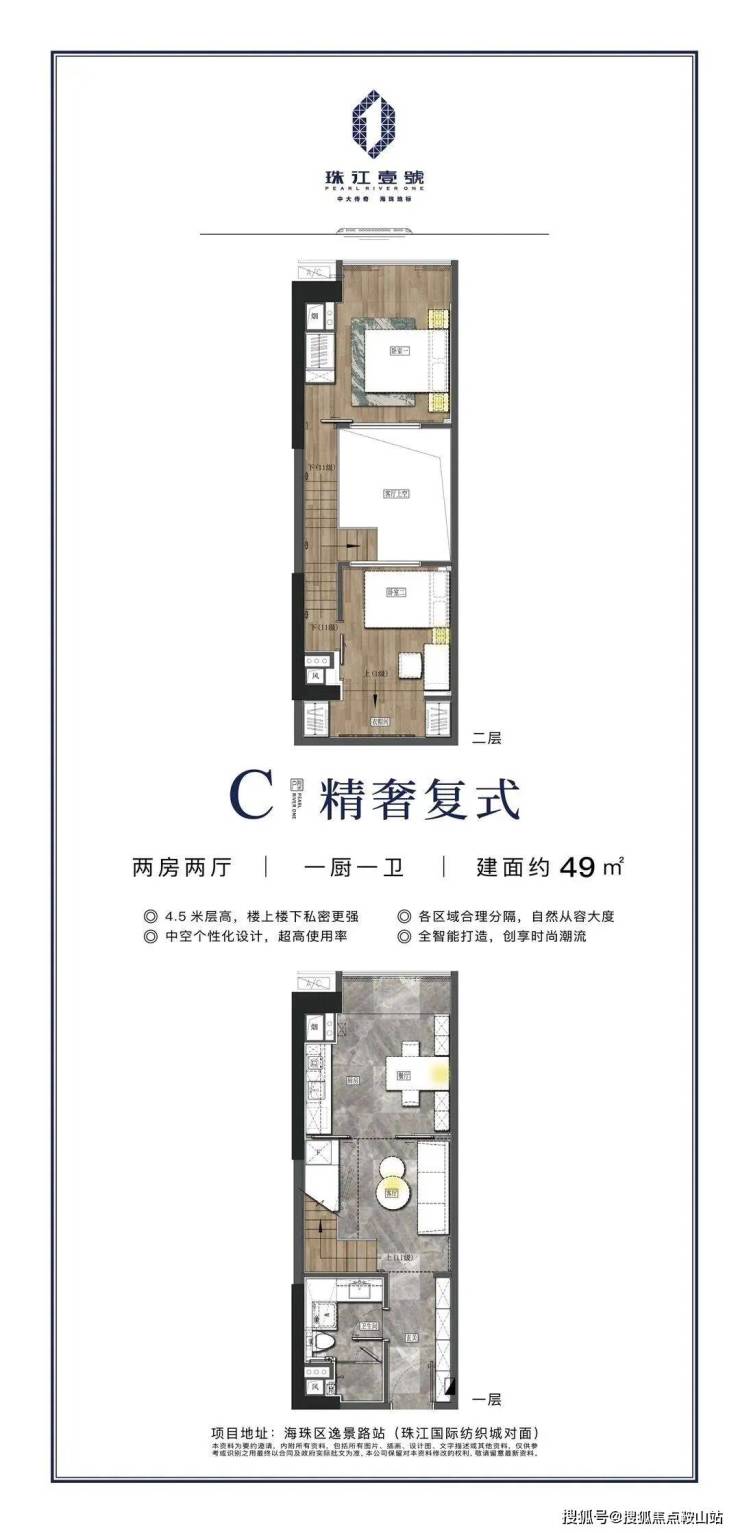 项目概况】开发商:珠江投资集团物业公司:缦合物业,破亿豪宅同款物业占地面积:约3.7万㎡建筑面积:约31万㎡,LOFT空间约6.8万㎡LOFT层高:约4.5m中空挑高复式面积段:49-95㎡二至五房总户数:875套梯户比:10梯35户层数:共34层(仅25个标准层)拿地时间:2005年交楼时间:2023年6月(预计22年10月可交付)产权年限:50年装修:精装修【交通配套】 5站珠江新城,5站琶洲 11号线逸景路站正上,现场可以看到地铁站正紧锣密鼓施工中。11号线作为大环线,串联起天河、越秀、荔湾、海珠、白云五大中心区,预计将于2022年通车。 项目坐落于2000亿中大商圈之核,与珠江新城、琶洲两大城市CBD,共筑广州商业黄金三角。中大国际创新谷,依托中山大学、中国科学院南海研究所等前沿资源打造重大国际创新谷,将成为集合科研总部、科技孵化、商务配套功能于一体的高品质创新科技集聚区。未来,中大商圈将以中大国际创新谷的全新风貌展现在世界面前,成就比肩世界的“广州硅谷”。珠江壹號凭借其不可复制的核芯地理位置,将成为炙手可热的当红明星。大体量商业旗舰,城芯风向标除了地标的稀缺价值、地铁物业价值之外,珠江壹号还坐拥一站式高端配套等多重优势,万达广场、合生广场以及珠江壹号自带的7万㎡时尚MALL举步即达,汇集全球时尚娱乐休闲,高端餐饮美食,文体商务等全配套生活业态,开启万千精彩生活。