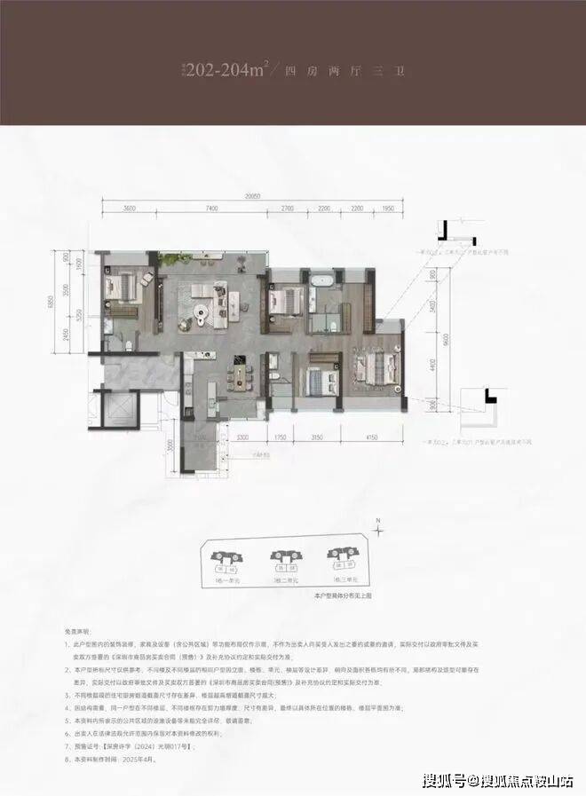204㎡四房两厅三卫(简装交付):折后总价1021-1105万/套,折后单价5.03-5.42万/㎡,顶豪配置适配终极改善。