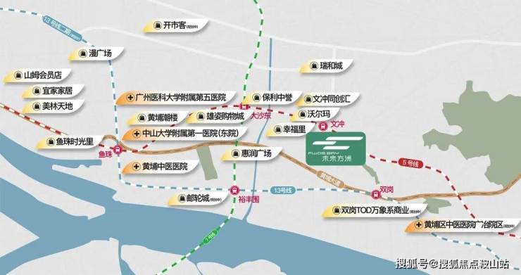 未来方洲项目周边配套丰富,优越的交通、教育、医疗、商业等资源,满足居民的各类需求。项目周边拥有双地铁5号线和13号线,出行便捷,珠金琶通勤圈内的商务及金融中心快速连接。项目邻近万象系商业体、文冲东、双沙大型购物商场等,提供完善的购物、休闲、娱乐设施。周边教育资源也十分丰富,未来方洲规划了4所中小学、4所幼儿园,打造12年优质教育体系,进一步提升区域的居住吸引力。