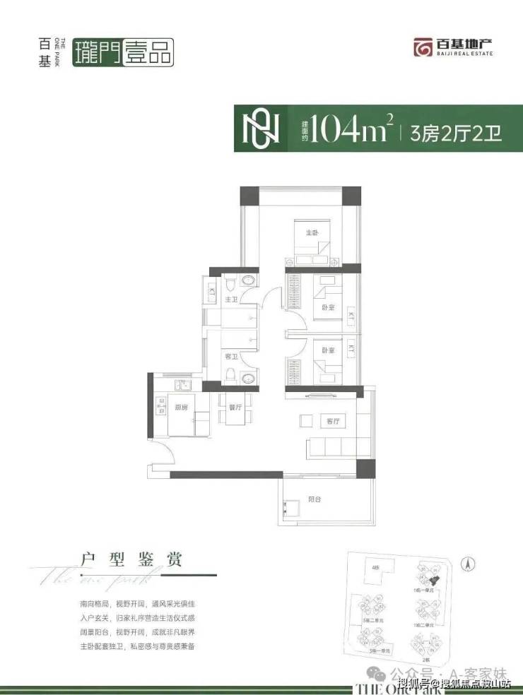 104㎡的3房2厅2卫,设计的是经典竖厅格局,进门入户玄关,客厅4.375米开间,LDKB一体化设计,动静分区,四开间朝南,主卧三面飘窗,U型厨房,卫生间干湿分离,得房率:71.29%(不含赠送),西南朝向。