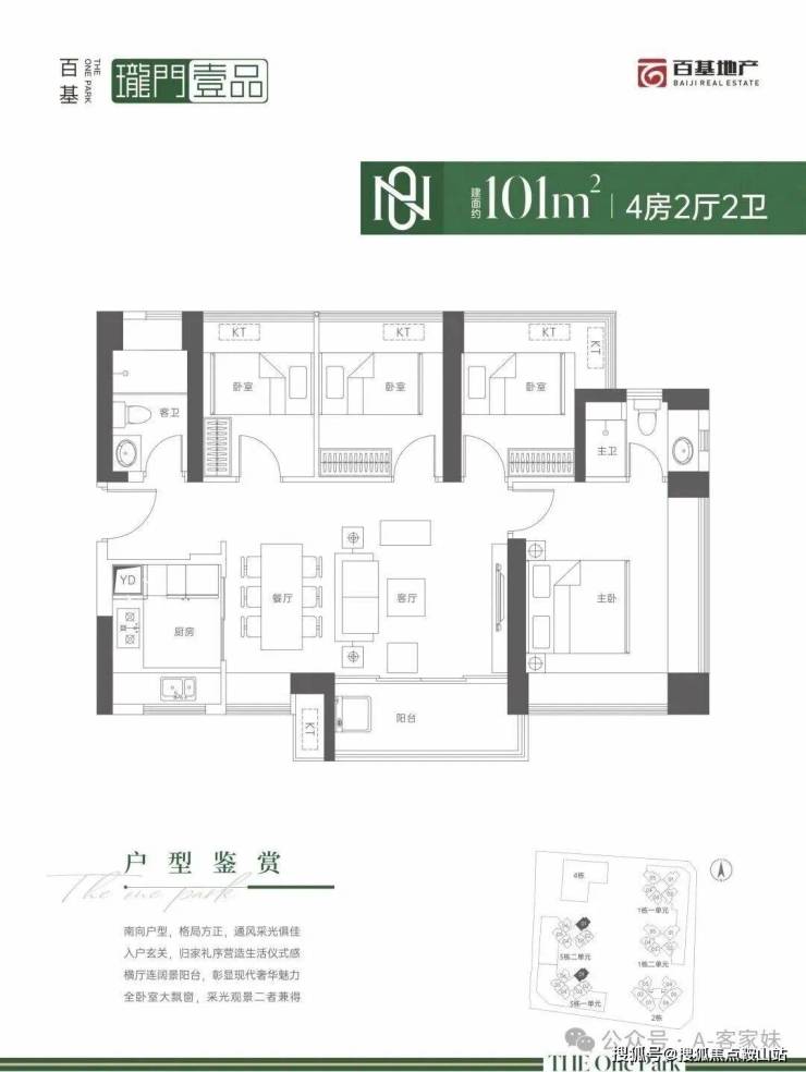 101㎡的4房2厅2卫,设计的是横厅南北通透格局,进门入户玄关,客餐厅5.55米开间,LDKB一体化设计,四开间朝南,4个卧室分别做到了3.85米/2.6米/2.4米/2.35米的宽度,主卧270°双飘窗,U型厨房,卫生间干湿分离,得房率:71.29%(不含赠送),阳台主朝东南向。