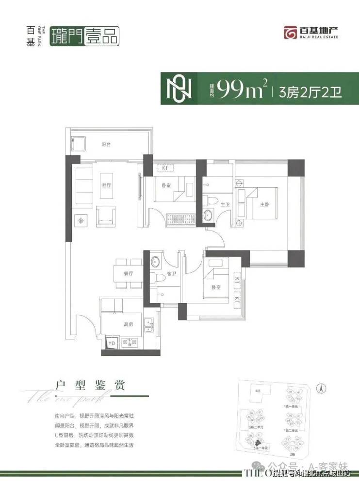 99㎡的3房2厅2卫,设计的是经典竖厅格局,进门入户玄关,客厅3.9米开间,LDKB一体化设计,动静分区,四开间朝南,主卧三面飘窗,U型厨房,卫生间干湿分离,得房率:71.29%(不含赠送),东南朝向。