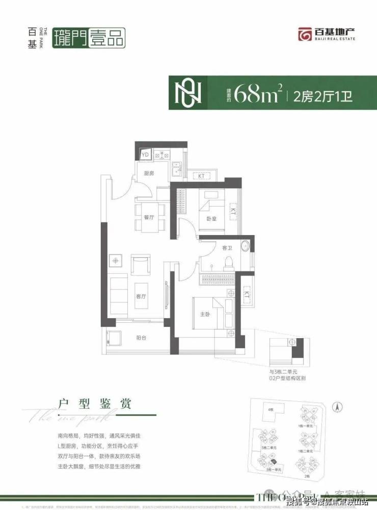68㎡的2房2厅1卫,仅3栋1单元02户型,设计的是竖厅格局,客厅3.2米开间,LDKB一体化设计,L型厨房,卫生间干湿分离,得房率:71.3%(不含赠送),东南朝向。