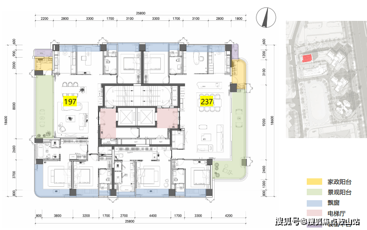 共有4栋住宅和1栋幼儿园,1、2、3栋的主力户型197-237-246㎡大平层。