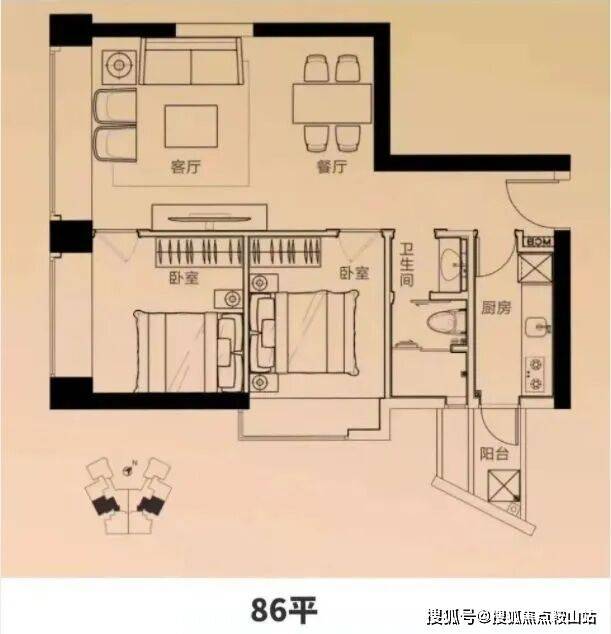 建面约86平大两房,南向阳台,阳光主卧,客餐直联,南北通透,空间感好,功能性强,居住体验非常舒适