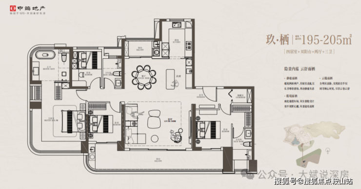 195-205㎡4房3卫:独立电梯入户,中西双厨房,餐客厅一体,双套房设计,端头主卧南北通,户型方正,四开间朝南,3面采光,整个户型十分通透大气。