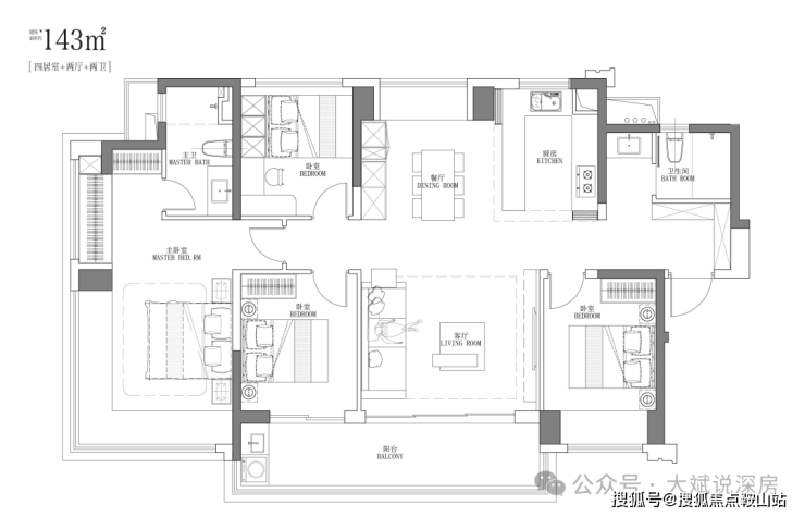 143㎡4房2卫:南北通竖厅4房格局,餐客厅一体,东南向看大运中心景观