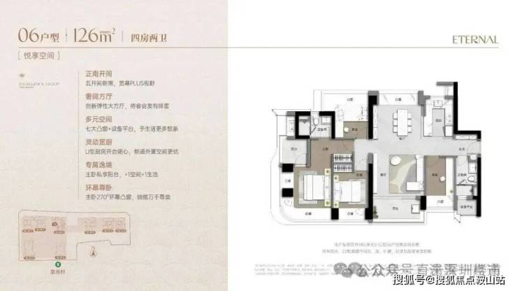 126m²的4房2厅2卫,设计的是竖厅南北通透格局,客厅3.9米开间,客餐厅分离化设计,五开间朝南,主卧套房270°环幕凸窗+私享阳台,七大凸窗+设备平台,分别做到了主卧20.23㎡/次卧9.92㎡/次卧9.3㎡/次卧8.77㎡(实测面积,去掉墙体),U型厨房,卫生间干湿分离,得房率超90%(包含赠送),正南朝向,看皇岗公园。