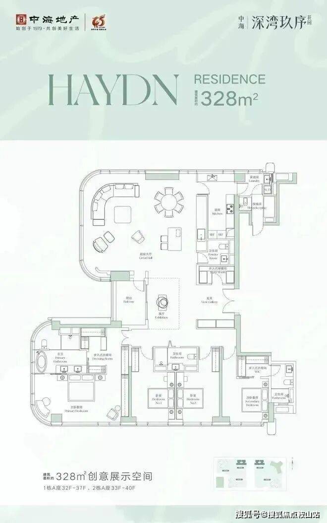 ①328平4+2房4卫,楼王户型,位于1栋A座01/02户,正南朝向,看小区园林景观。独立保姆套间,外立面采用270度玻璃幕墙,采光和通透好!
