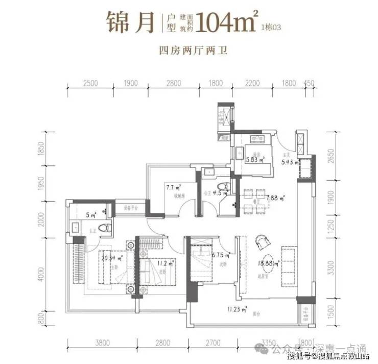 104㎡的4房2厅2卫,设计的是竖厅格局,客厅4.15米开间,LDKB一体化设计,预留冰箱卡槽位,四开间朝南,动静分区,主卧270°无柱转角飘窗还带1个设备平台约1.52平,分别做到了主卧20.34㎡/次卧11.2㎡/次卧7.7㎡/次卧6.75㎡(包含墙体飘窗),U型厨房烟道外置,卫生间干湿分离,得房率约100.71%(包含赠送),客厅连接次卧出大阳台约11.23平,西南朝向。