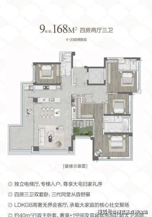同时,在可实现四套间+保姆套间的豪华套房配置下,不论三代同堂还是多孩家庭都可游刃有余,实现家庭成员的平权化,又可高效处理家务,尊重私人领域。