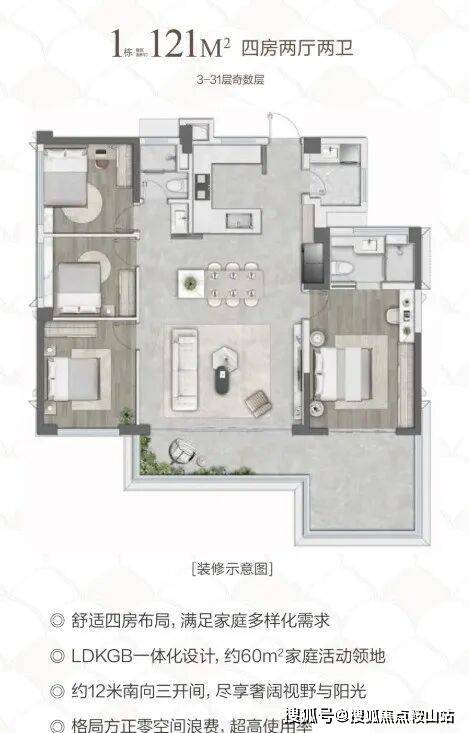 1、建面约121㎡舒适四房,拥有约60㎡家庭活动领地!