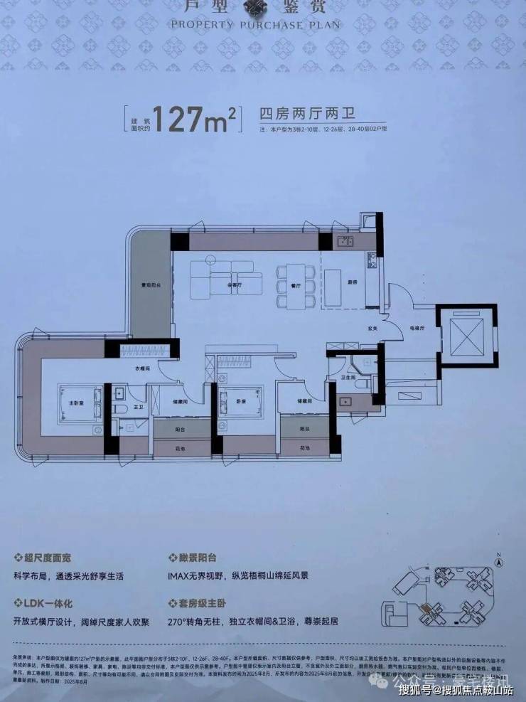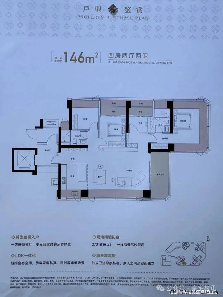 将地标高度/创新设计/极致景观/自然融合四大要素集于一体,约150米地标建筑以45°错位转体设计,实现四户分踞四角的独立瞰景布局,每户均可享有极致山海景观。约55米超宽楼间距、0.6的黄金窗墙比远超常规住宅0.3-0.5的标准,呈现山景、海景、花园三重景观界面。