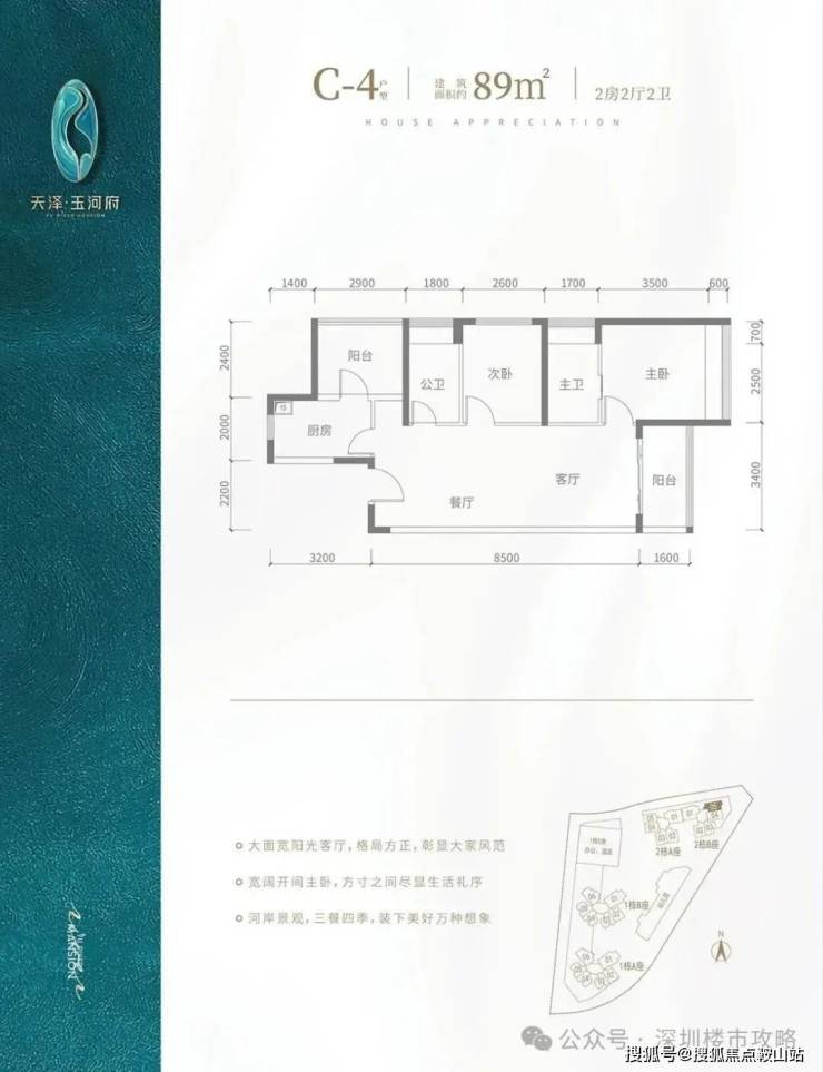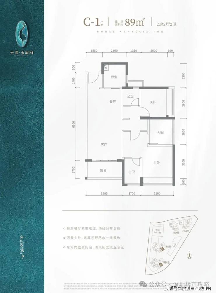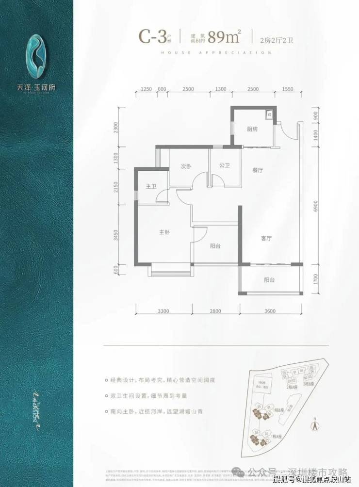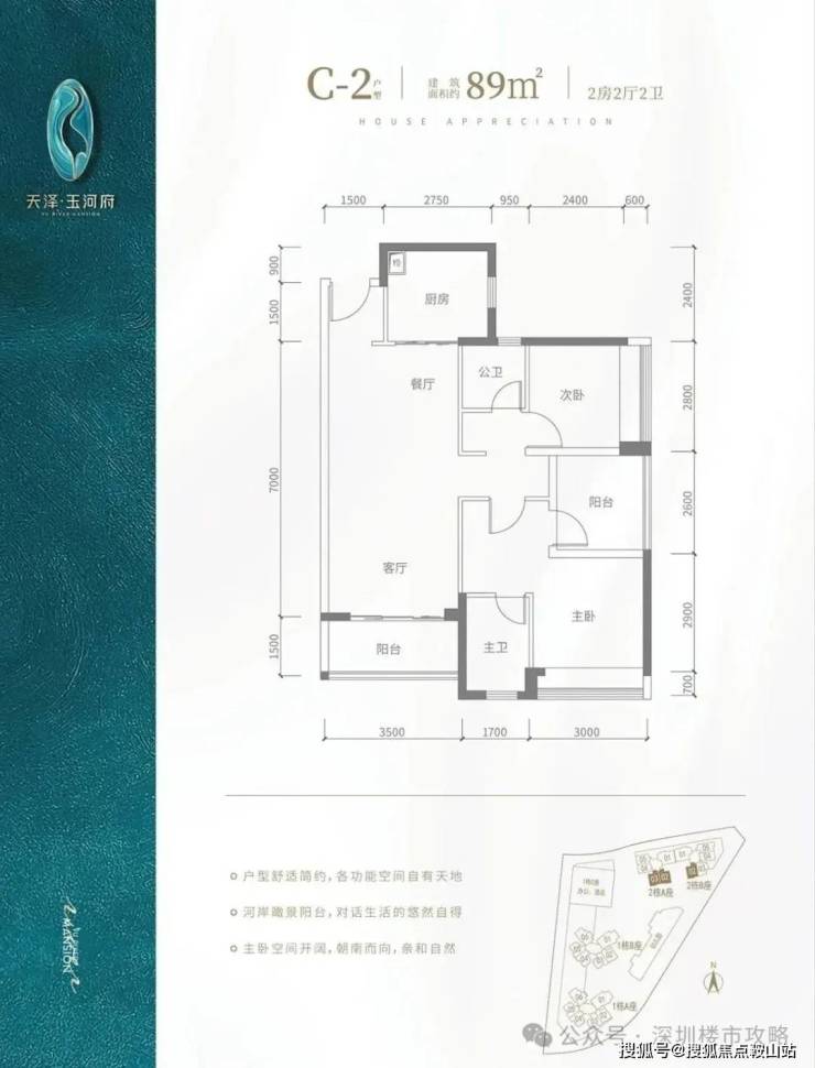 c2 户型-89㎡-3 房 2 厅 2 卫:竖厅格局,客厅 3.5 米开间,主卧及客厅阳台朝南向,房间宽度分别为 3、2.8、2.6 米,公卫三段式分离,东南朝向,看茅洲河景观,得房率包含赠送约 90.9%。