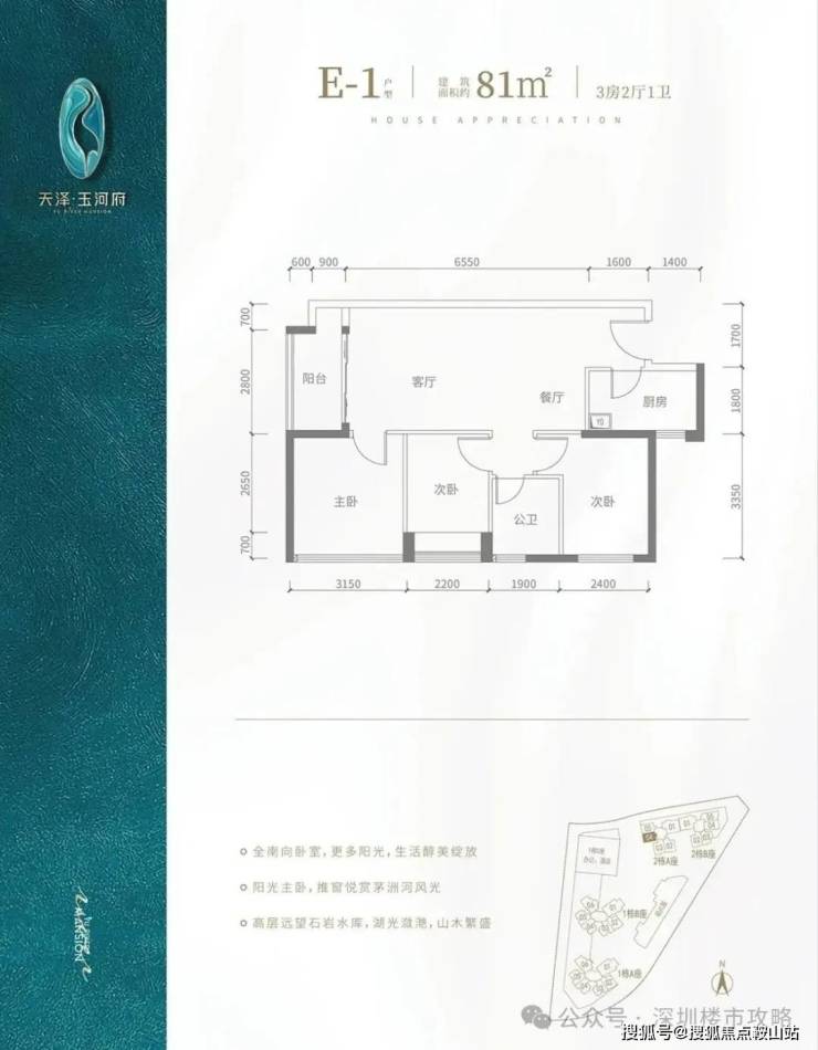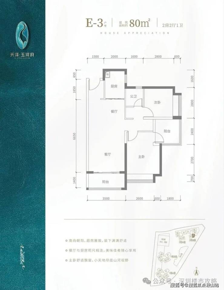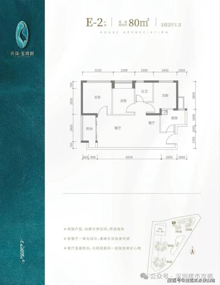 e2 户型-80㎡-3 房 2 厅 1 卫:竖厅格局,客厅 3.5 米开间,餐客厅一体化,阳台 2.8 米长,朝西向,得房率包含赠送约 83.7%,阳台进深 1.5 米,朝西南向。