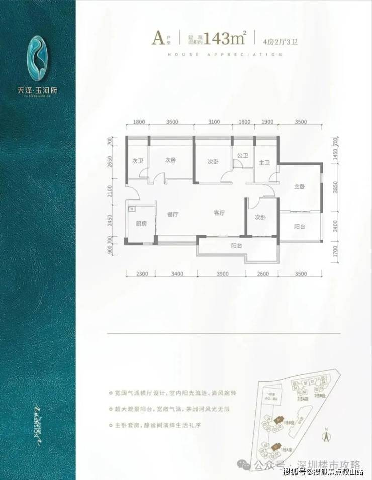 a 户型-143㎡-4 房 2 厅 3 卫:横厅南北通透格局,客餐厅开间 7.3 米,超大观景阳台 6.5 米长,全屋飘窗设计,主卧套房设计,房间宽度分别为 3.6、3.5、3.1、2.6 米,L 型厨房,得房率包含赠送约 91.1%,主朝东南朝向,看茅洲河景观。