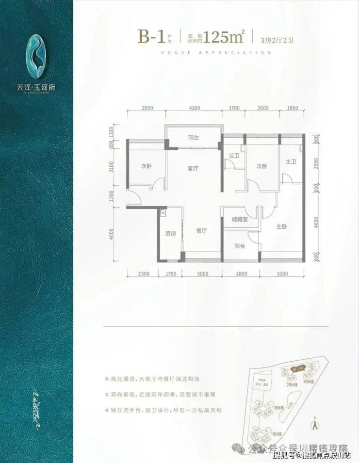 b1 户型-125㎡-4 房 2 厅 2 卫:竖厅南北通透格局,客厅 4.2 米开间,阳台主朝北向,全屋飘窗设计,房间宽度分别为 3.3、2.85、2.8、2.6 米,L 型厨房,得房率包含赠送约 91.1%。