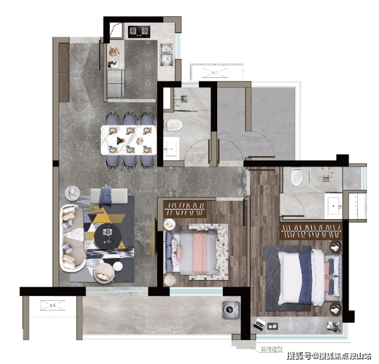 这个户型在传统竖厅基础上,突破性地设计了超5.5米长的南向大阳台,引江景入室。