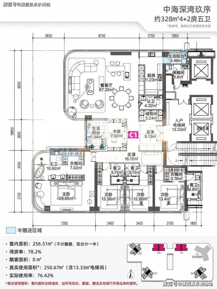 约328㎡4+2房五卫 138套三梯两户(专梯专户):最强户型,专梯专户配置拉满,室内全套间带保姆间,中西厨餐客厅一体的动区,使用功能上几乎是没有缺点的设计。若是按照限价13.3万/㎡浮动计算,这个户型好点楼层大概率要去到5000万