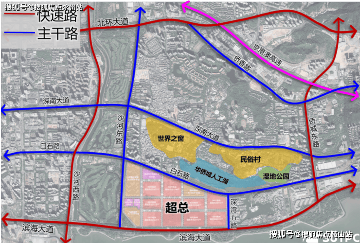 片区南接深圳湾,与香港隔海相望,北倚华侨城内湖湿地,西邻沙河高尔夫球场,东至华侨城欢乐海岸,为塘朗山-华侨城-深圳湾城市功能空间轴的核心区段之一。
