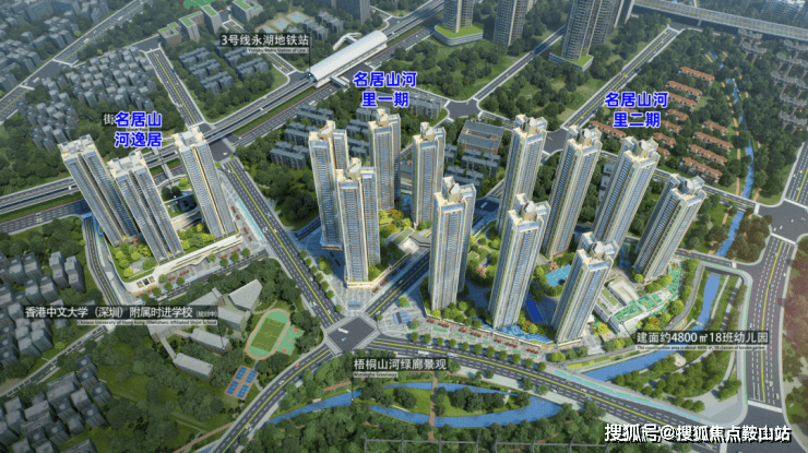 休闲方面,名居山河里紧邻梧桐山河碧道,建设长度约2.4公里,建面约15.66万㎡,环山亲水,串联街心公园与滨河绿廊,打造慢行系统,匠心创著专属绿海水岸IP,成就城市奢适自然主场。