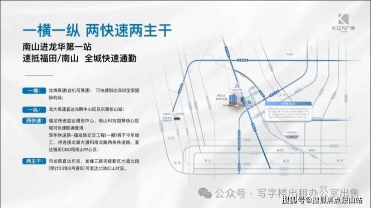 福龙快速直达福田车公庙,可快速联通香港。深华快速路-福龙路立交工程(一期)将于今年竣工,连接龙澜大道和福龙路两条快速路,未来侨城东路北延线开通后,一站直达南山中心区,