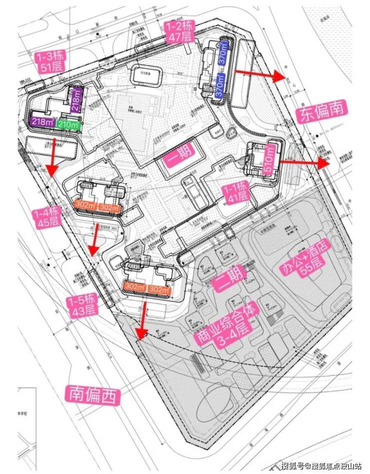 楼栋命名修改,由座改为单元;建筑高度及层数修改,1栋一单元、二单元、五单元层数不变,建筑高度微调;1栋三单元层数由54层改为51层、高度由192.42米改为183.12米;1栋四单元层数由49层改为45层、高度由182.77米改为168.97米。塔楼和裙房建筑轮廓调整,消防登高场地微调。裙房南侧商业改为文化活动室;南侧和二期之间的连桥宽度及位置更新。架空停车场出入口由东南角调整至西南角。屋顶总平面图中增加公共配套及垃圾收集房、雨水调蓄池等的位置及范围表达。