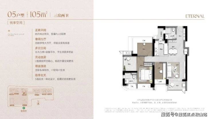 105㎡3+1房两卫(约1003-1144万):竖厅格局,次卫设在进门处,去洗手间需要绕过厨房和餐厅,有两个次卧都要睡飘窗。主卧出阳台可以改房间,但面积较小,更适合做书房或储物间。这个户型实现了四开间朝南+3+1房灵动布局,客厅与阳台相连,采光通风俱佳,满足三代同堂或二孩家庭的改善需求。